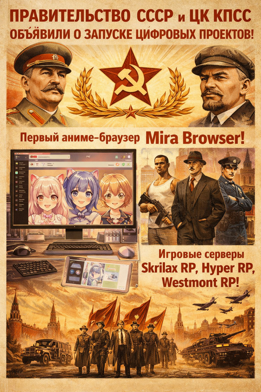 Правительство СССР и ЦК КПСС сообщили о начале разработки и поддержки инновационных цифровых проектов, включая первый аниме-браузер Mira Browser, а также игровые проекты нового поколения: Skrilax RP, Hyper RP и Westmont RP.